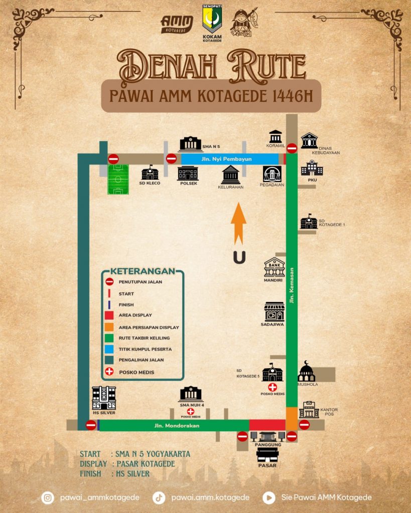 Pawai Takbir akan dilaksanakan Ahad, 30 Maret 2025 jam 19.00 sampai selesai. Start dari Jalan Nyi Pembayun, lalu menuju Jalan Kemasan, kemudian sampai Jalan Mondorakan. Adapun untuk area display, akan berada di depan Pasar Legi Kotagede.